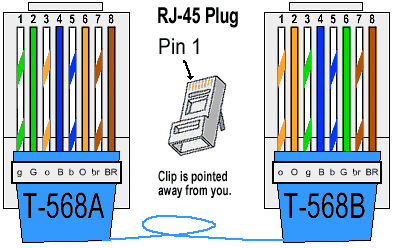 การเข้า LAN สำหรับการทำสายครอสนี้สามารถทำได้ง่ายๆ คือ ฝั่งหนึ่งเข้าหัวตามมาตรฐาน TIA/EIA 568A และอีกฝั่งหนึ่งเข้าหัวตามมาตรฐาน TIA/EIA 568B ดังรูปข้างล่างครับ