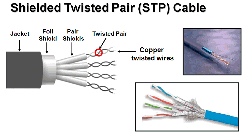 สาย STP (Shielded Twisted Pair Cable) เป็นสายแบบตีเกลียวเป็นคู่ๆ ทั้งหมดสี่คู่ ซึ่งมีเกราะป้องกันสัญญาณรบกวนจากภายนอก (Foil Shield) โดยดูได้ตามรูปข้างล่างครับ